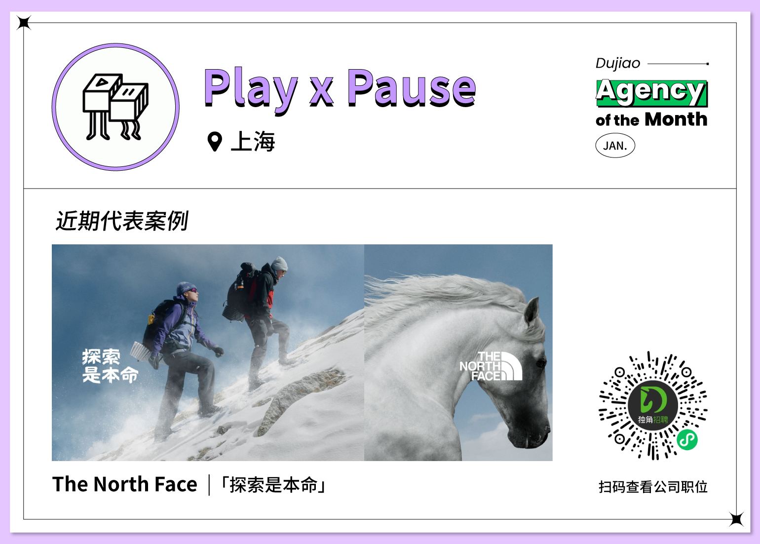 Play × Pause,2017 年成立的独立创意机构,尤其在服务户外运动品牌上拥有丰富经验。此前在业界取得很好反响的线下快闪地标《彪马路》、 Vans × 范志毅「范得着吗」、PUMA 公益纪录片《好球!徐建梅》,以及李宁「韦德之道 10」、探路者「以巅峰为证」、凯乐石「坡有引力」都是出自他们之手。另外,Play × Pause 近年还为 Columbia 创作了一系列广告片,包括「走进自然,自然会玩」、夏日徒步广告片、Columbia × 张婧仪「一起开启自然新体验」,以延续性的主题广告片助力 Columbia 强化品牌主张。