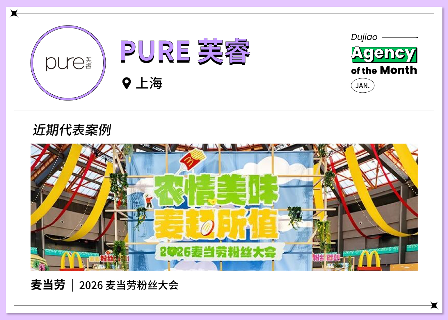 去年底,「麦粉」们有没有关注 2026 年麦当劳粉丝大会?去年 12 月,麦当劳中国第二届粉丝大会在上海西岸穹顶艺术中心圆满收官。PURE 芙睿负责此次活动的创意设计、制作与活动执行。他们将整个场馆打造成一个充满活力的农场市集,并设置了丰富的互动体验区、美食试吃区,将农人日记融入活动中,大家可以在农场氛围中感受麦当劳的魅力。此外,他们也在现场为麦麦粉丝特别设置了两大特色区域,呈现出品牌对社群文化的积极响应。
