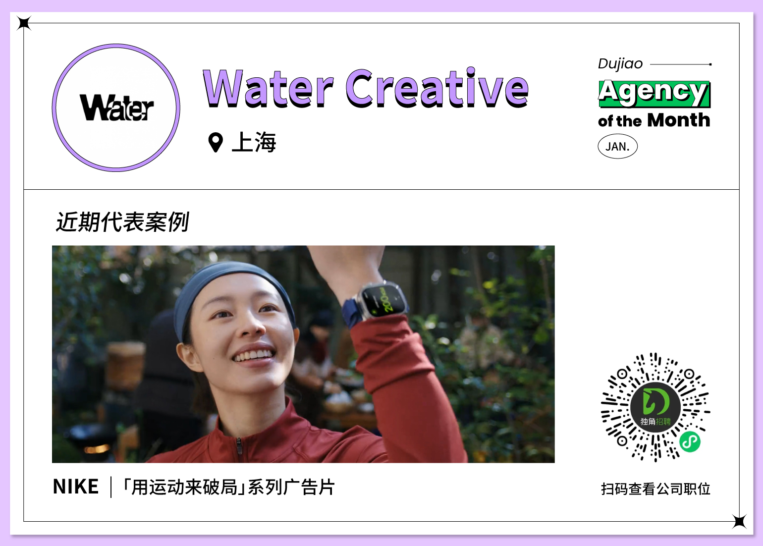 Water Creative 是一家年轻的独立广告公司,2021 年在上海创立,成立初衷是为了帮每一个客户做出他们职业生涯的最佳作品。这几年,他们先后为 NIKE、ALIPAY+ 、BOSE、狼爪、IKEA、Jordan、Columbia、支付宝、moodytiger 等等品牌打造过一些不错的案例,包括 NIKE《爸妈说 GO》系列纪录片、NIKE 「Air Max Dn - 上天不落地」、IKEA 《拒售亿万富豪》系列、狼爪 × 莫文蔚「轻进山野」、NIKE《就得妳出手》、Columbia × 蒋奇明「 撒开了玩」等作品,也多次入选 SocialBeta 年度新锐代理商。