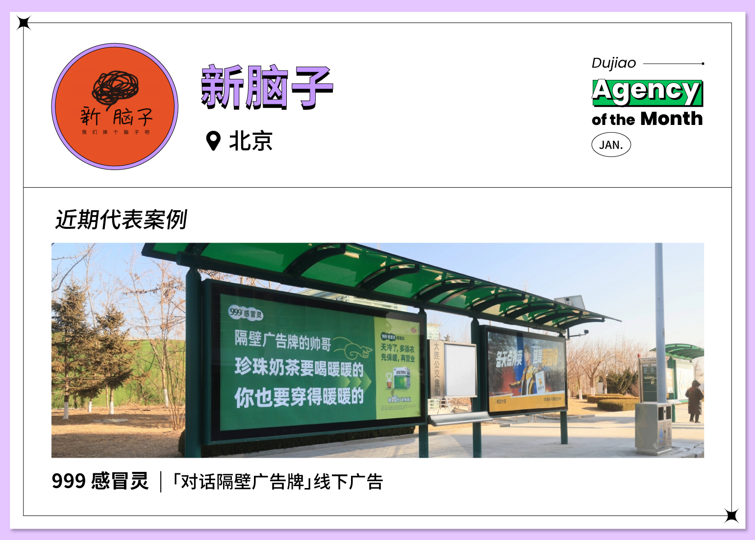 此前,在地铁、公交站、商圈写字楼的广告牌隔壁,出现了一块「搭讪」隔壁帅哥的广告牌。这是新脑子为 999 感冒灵打造的「对话隔壁广告牌」线下广告。他们通过在其他品牌的广告旁设置「对话式」文案,借喊话隔壁明星,为围观路人送去暖心的关照。新脑子巧妙借势明星流量,以轻量化、场景化的文案互动,吸引路人拍照打卡,带来更多线上 UGC,助力 999 感冒灵传递品牌温度。
