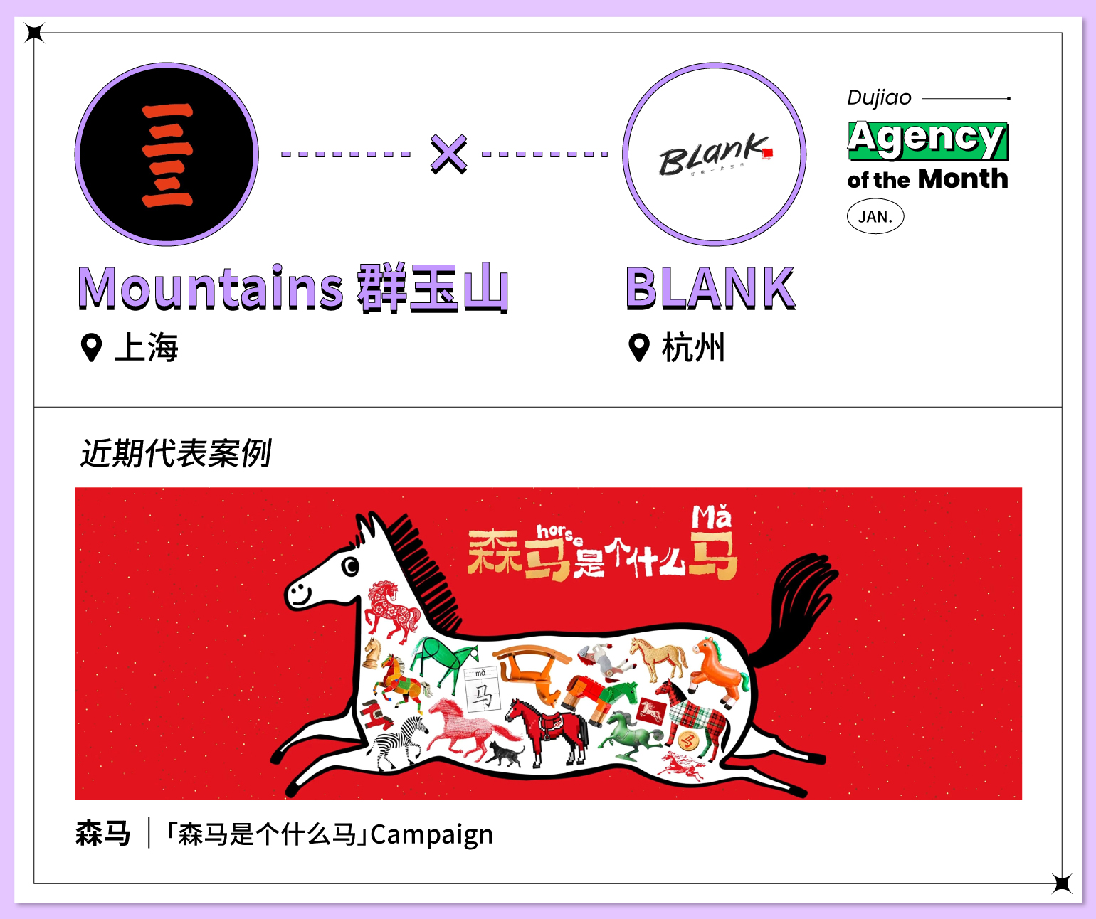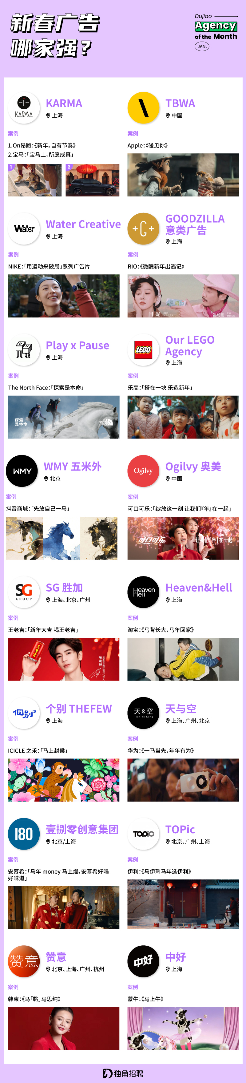 此外,随着 2026 丙午马年来临,这个 1 月涌现了诸多精彩的新年营销创意。因此本月 Agency of the Month 盘点,我们着重关注了一些优秀案例背后的代理商们,一起看看他们马年交出了怎样的答卷。