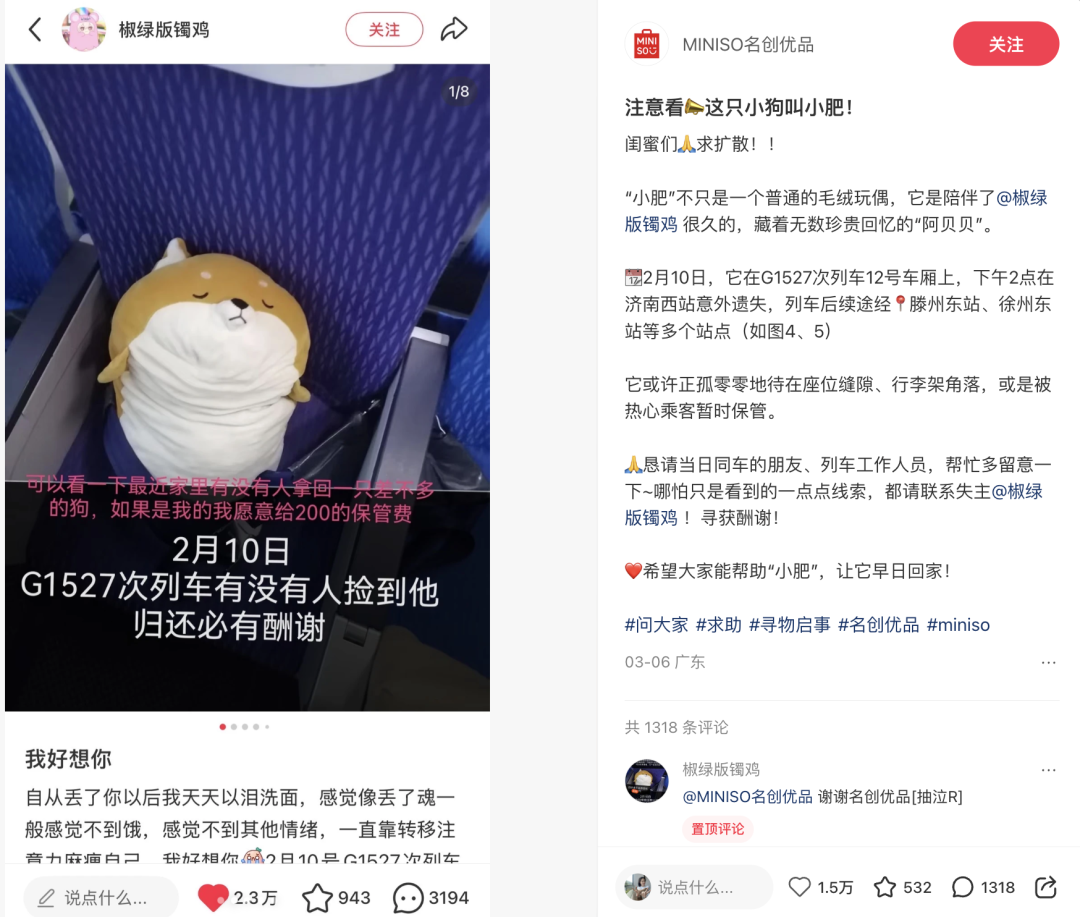 一眼就能发现此次名创优品不是做做样子,而是真心实意希望网友的宝贝回家。从玩偶「小肥」的的面部细节特征,到丢失的具体车厢和列车后续途径的站点,都一一标注出来,比失主本人的发帖还要条理清晰。