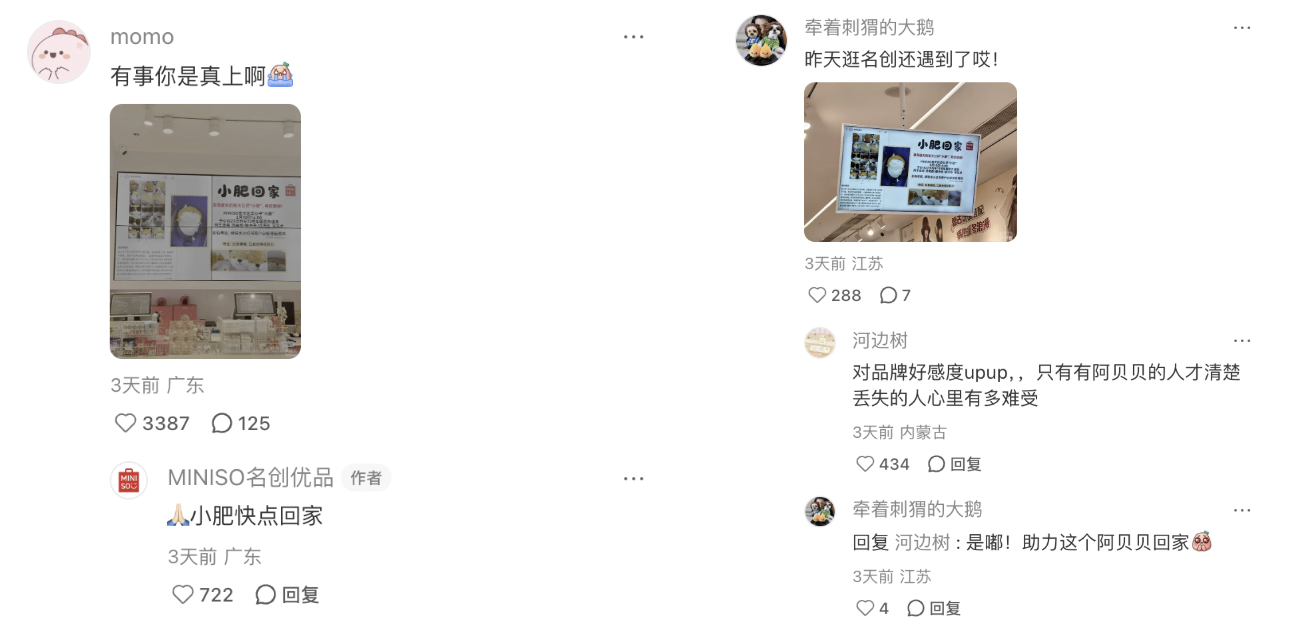 不止于在线上倡议,名创优品还在广东、江苏等多地的线下多门店大屏紧急播放这一则「小肥回家」的寻物启事,让走过路过的消费者都能留意到这则信息并帮助传播,做到最大程度的曝光。