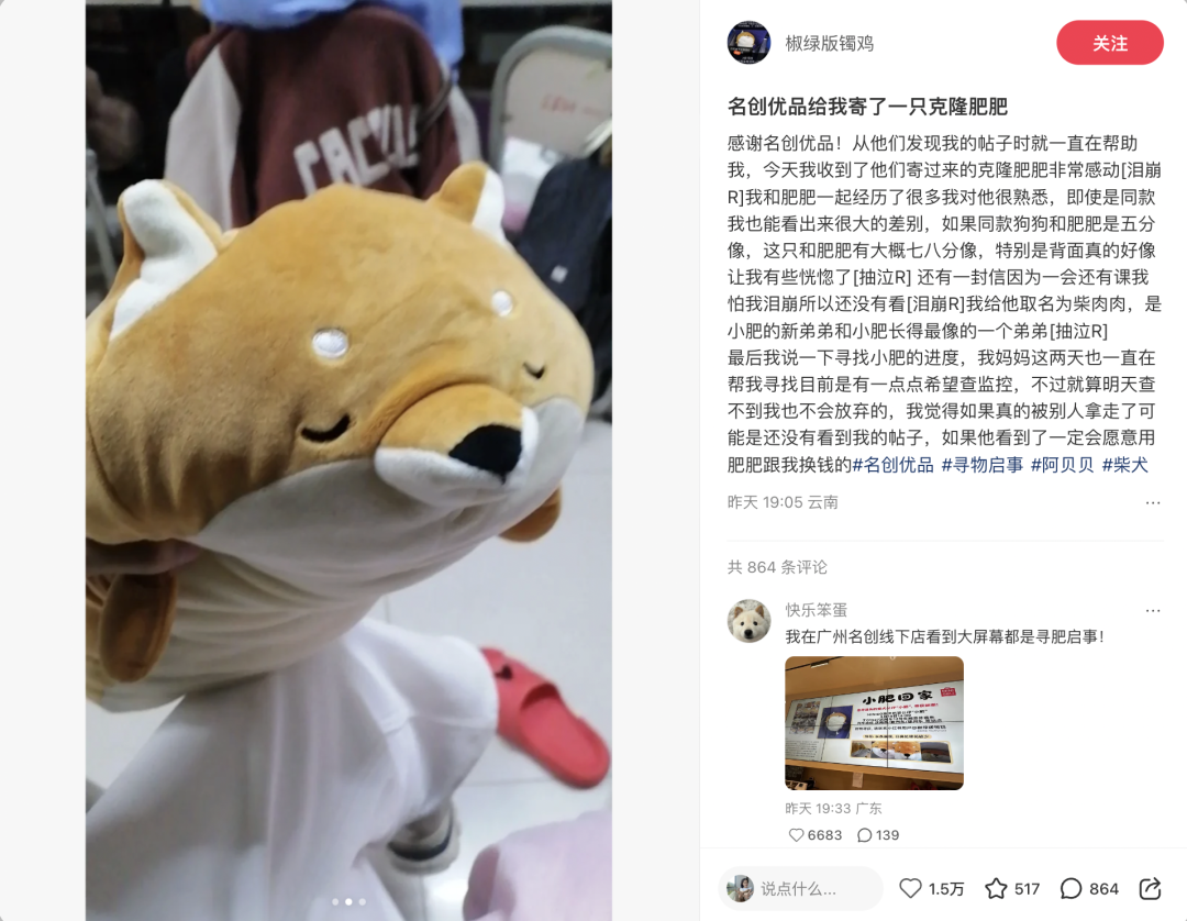 到这一步,网友发布的寻物信息已出圈,名创优品也收获了满满口碑,但整个事件还没有剧终!很遗憾发帖至今失主还没有寻回自己的「小肥」,但她收到了名创优品寄来的一只克隆版玩偶。