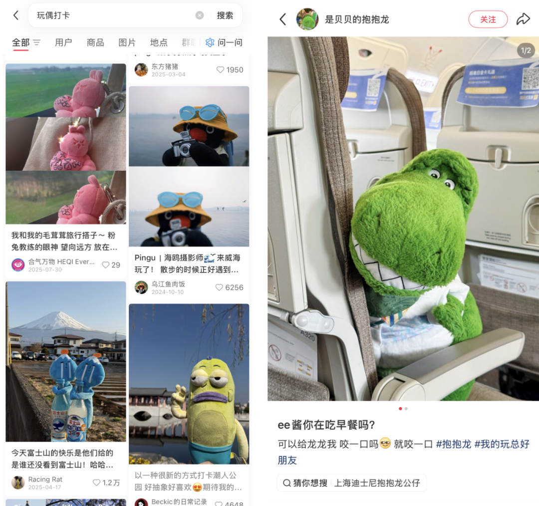 在小红书上,#毛绒玩具也有生命 的话题浏览量超过 5.1 亿次,玩偶成了最贴心的「搭子」,大家带着它们旅游打卡,体验生活,甚至为自家宝宝建立专属的账号,用玩偶的眼光看世界: