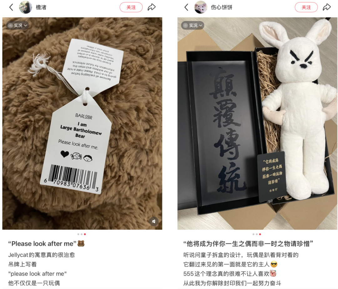 于是我们看到,身处其中的品牌也在积极守护用户与玩偶之间的情感联系:Jellycat 在每个玩偶的标签上写下「Please look after me」的嘱托;问童子用「它将成为伴你一生之偶」讲出玩偶和主人之间的羁绊......