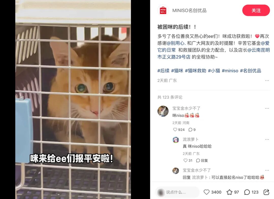 就在最近,名创优品的社媒官方账号上又更新了一则与网友共同完成的「爱心接力」。收到网友反映,一只流浪小猫被困在昆明一家名创优品门店的墙柱内,品牌门店随即联系了当地的救援机构,积极配合墙体拆除和营救,并且负责了小猫后续的体检与安置领养,用真诚善举收获了网友的一致力挺和「咪 niso」的爱称。